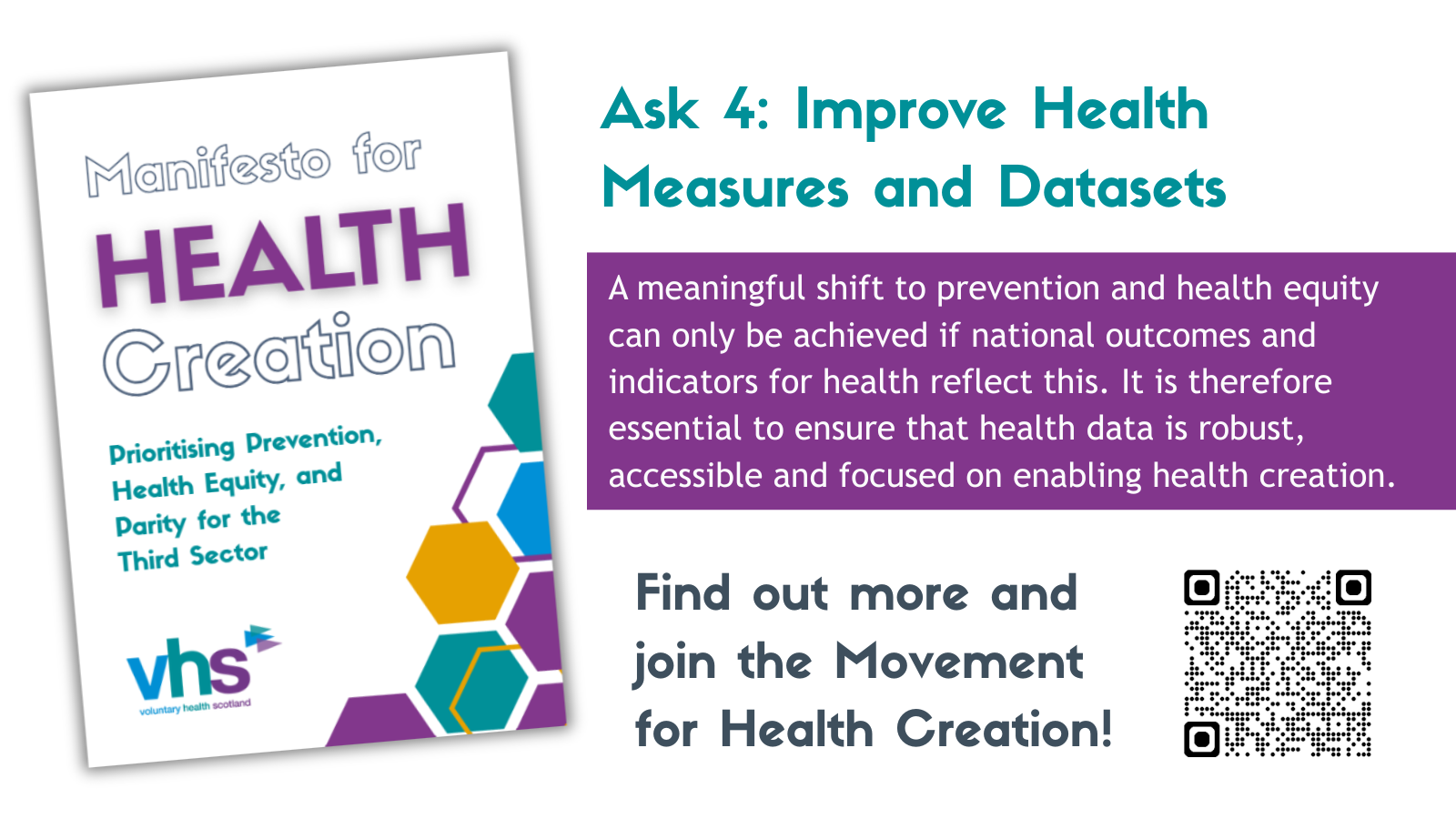 If you would like to promote our Manifesto for Health Creation policy asks around prevention, health equity, third sector parity, and health data, we have produced these social media graphics for you to download and use: