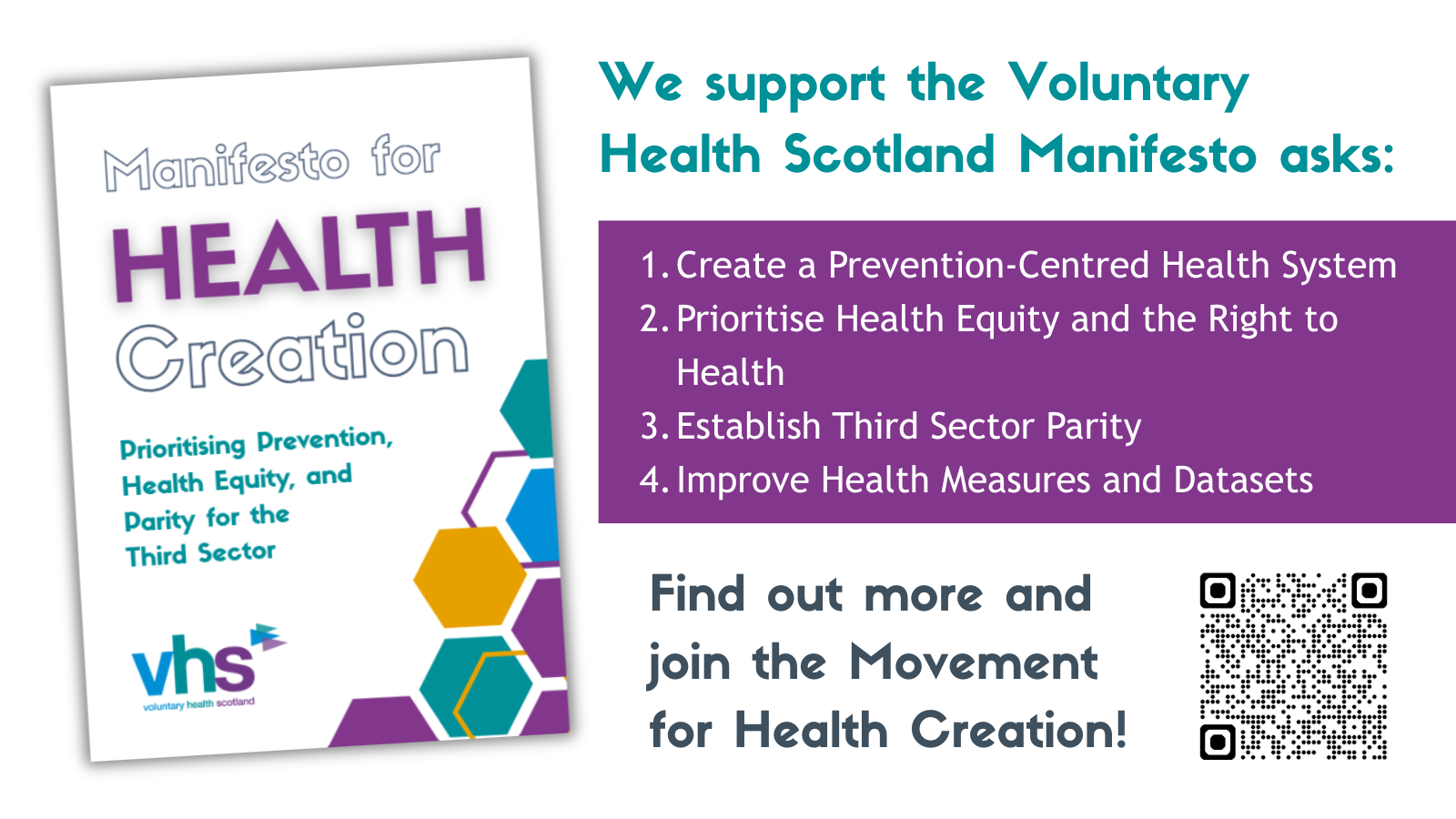 VHS will continue to promote the asks detailed in our Manifesto for Health Creation, published in October last year, until the election. We will not meet the criteria to register as a non-party campaigner.