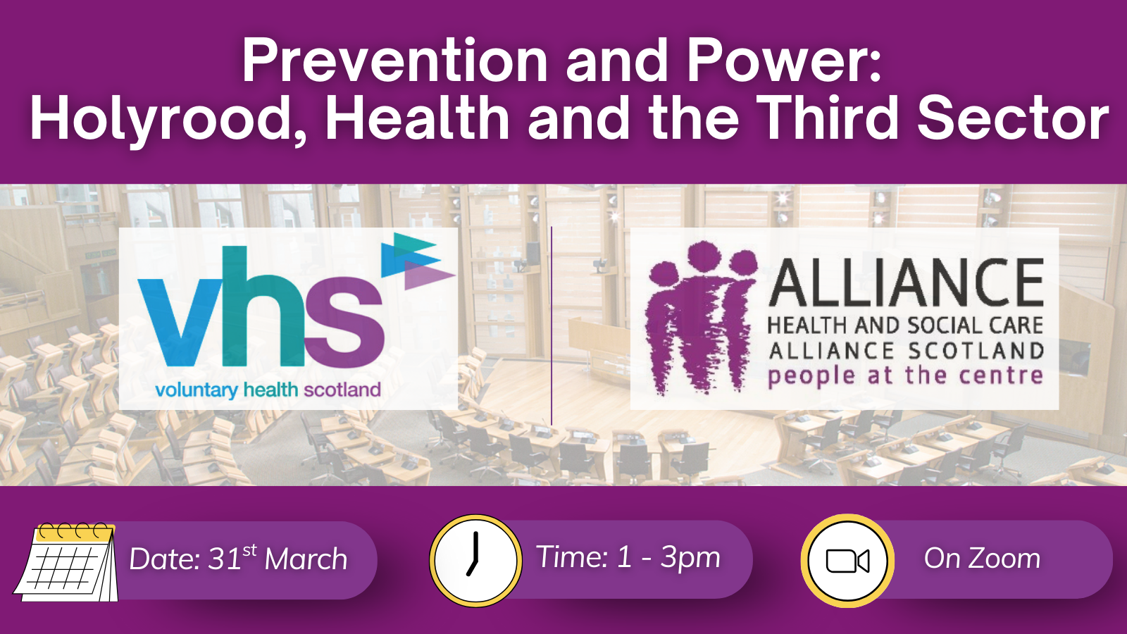 The Health and Social Care Alliance (The ALLIANCE) and Voluntary Health Scotland (VHS) have joined forces to bring you this important pre-Election online hustings event.