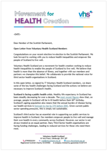 We are inviting Voluntary Health Scotland members to sign our Movement for Health Creation Open Letter which will be sent to new and returning MSPs following the election in May.